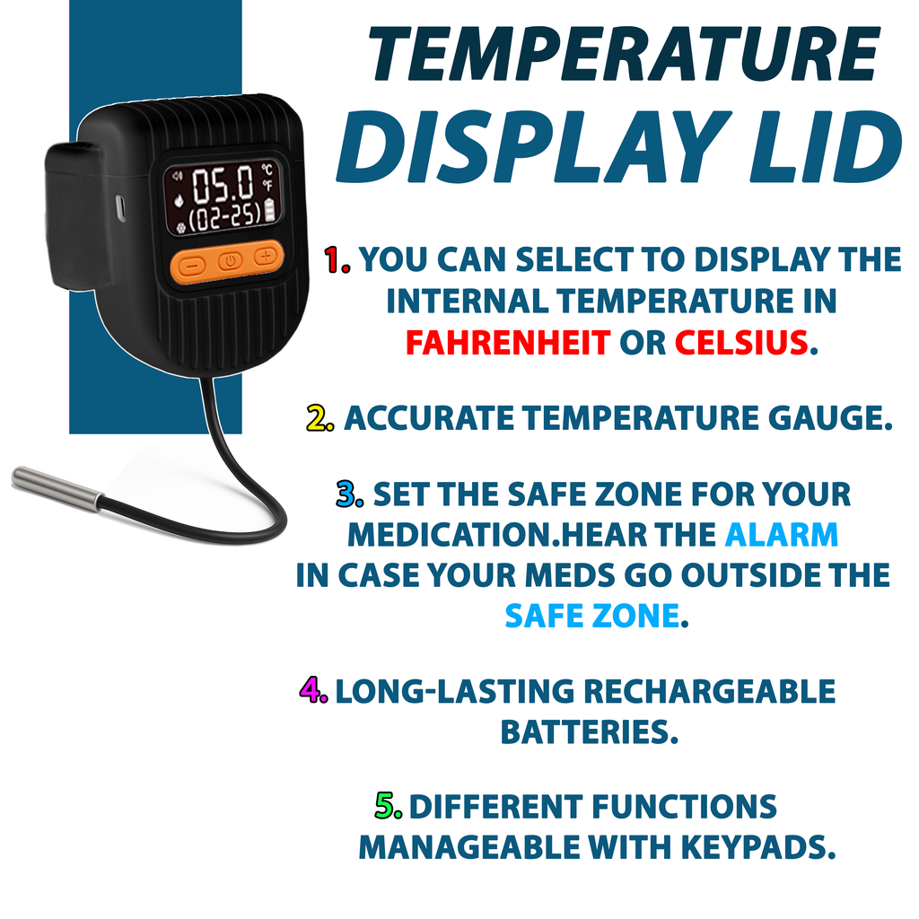 6️⃣ Monitor the Temperature - Check the touch-screen temperature display any time you need to confirm your medications are stored within the safe range (shown in both °C and °F).