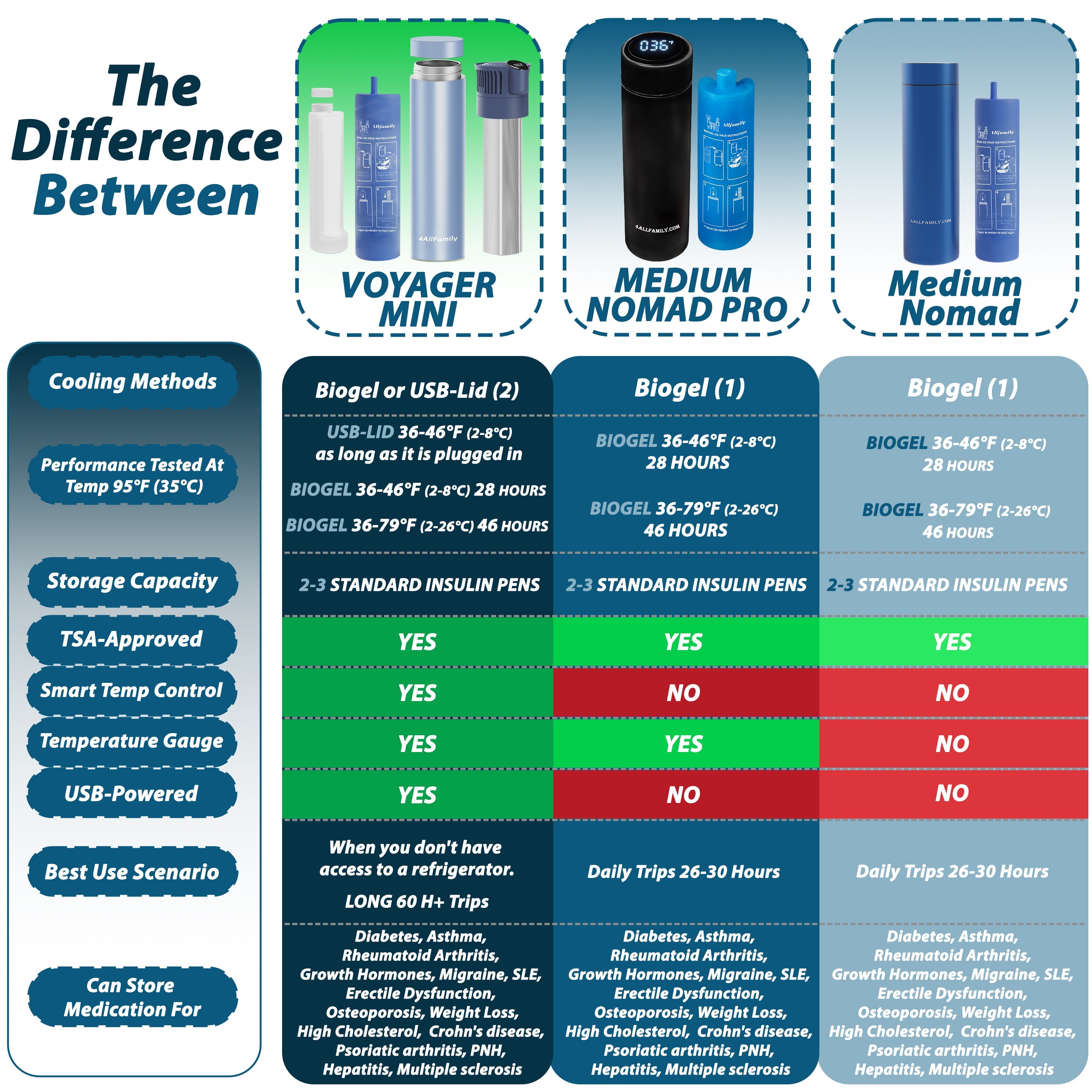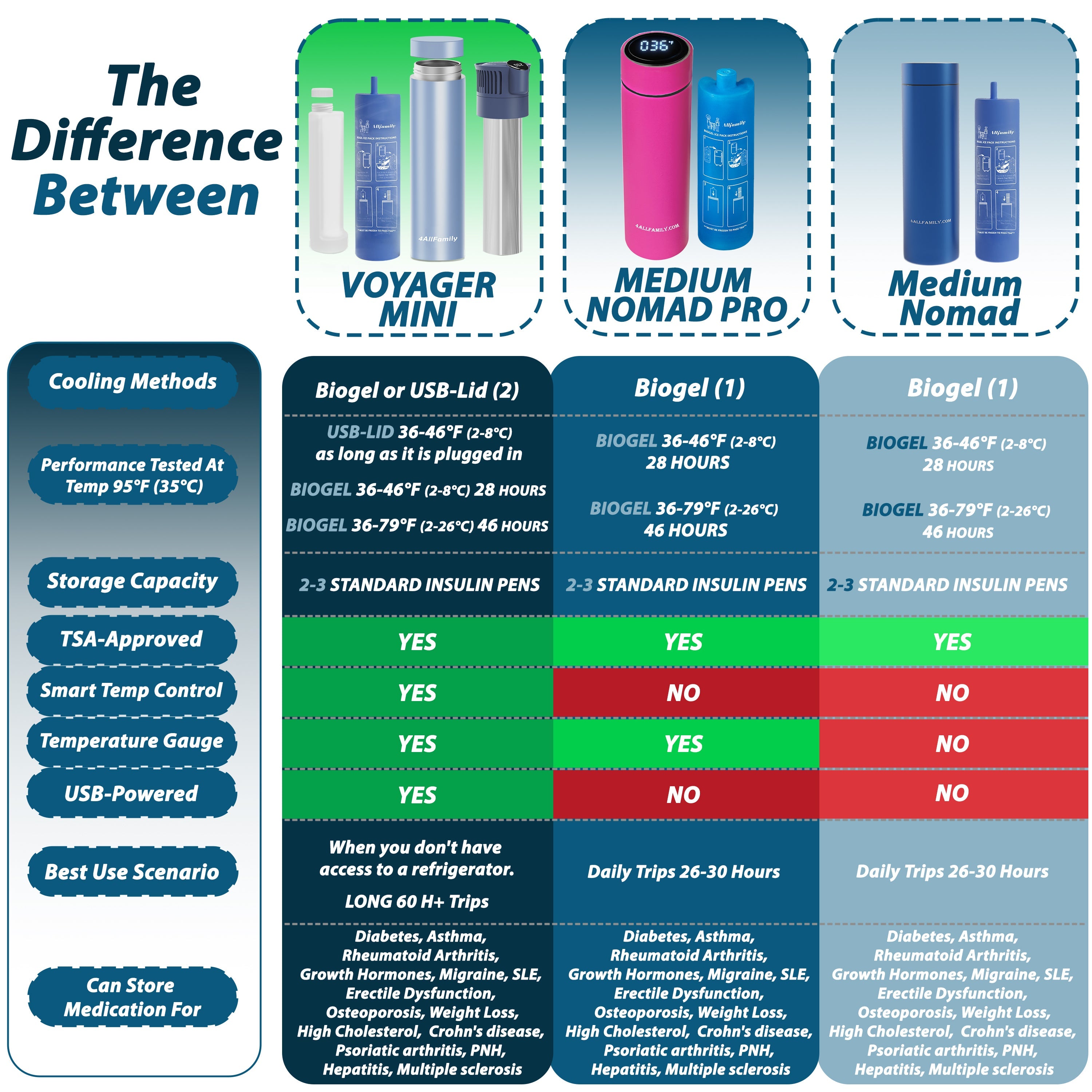 Both keep your medication comfortably cool without the extra refrigeration power of the Nomad PRO!