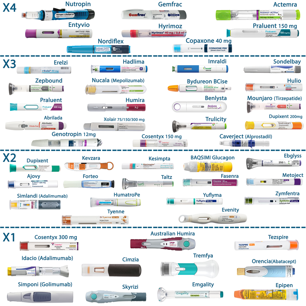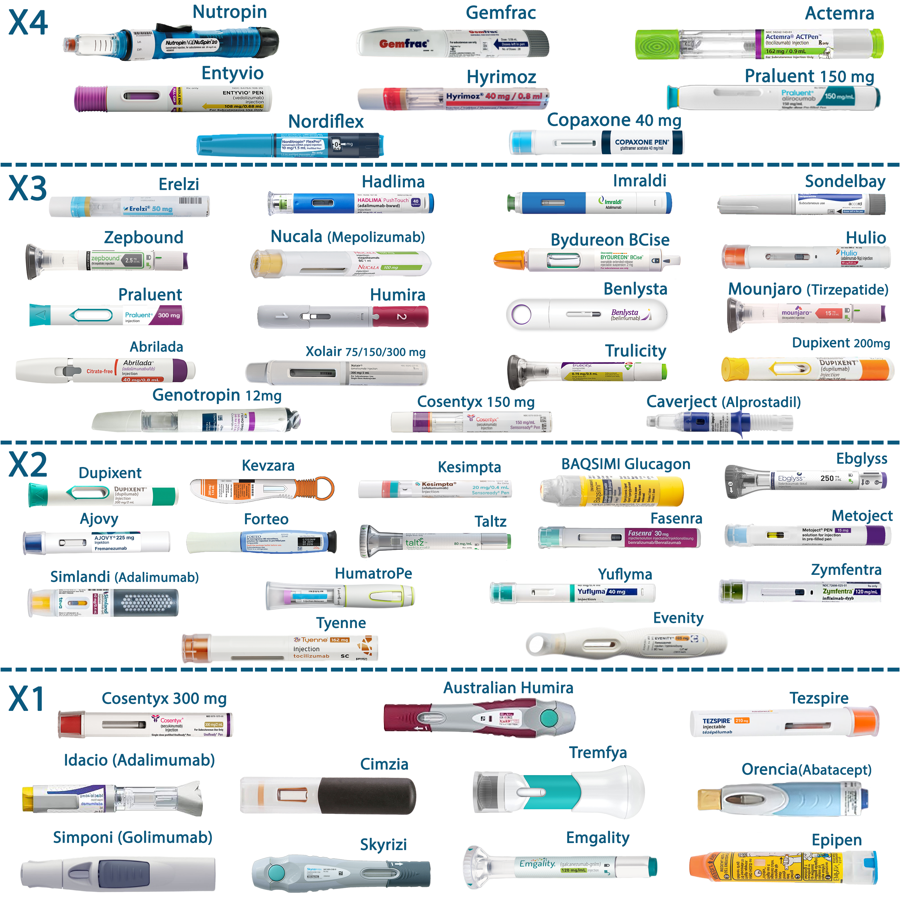 pen, Nutropin, Norditropin, Benlysta, Caverject, Forteo, Praluent 300 mg, Humira pen, Humira syringe, Avonex, Kesimpta, Dupixent.